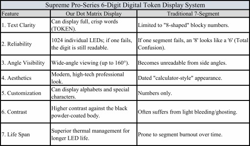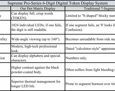 Dual-Row Dot Matrix Technology: * Top Row: High-resolution LED text displaying "TOKEN NUMBER." Unlike printed stickers that fade or get washed out by 7-segment glow, our LED-rendered text remains sharp and visible in all lighting conditions.